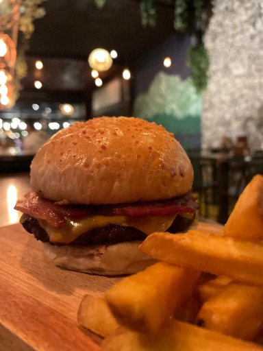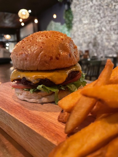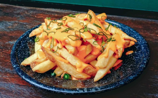 Bondiola, salsa barbacoa, cebolla caramelizada y queso azul.