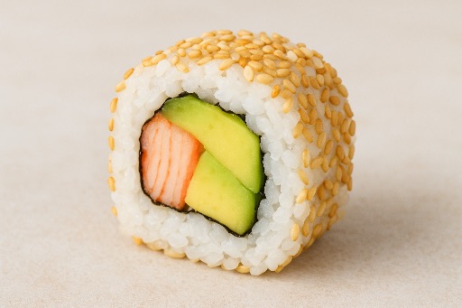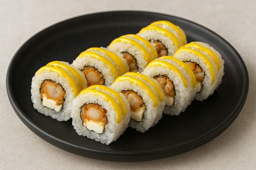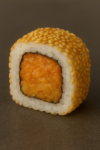 Salmón tempura, queso, cubierto con palta y salsa de frutos rojos