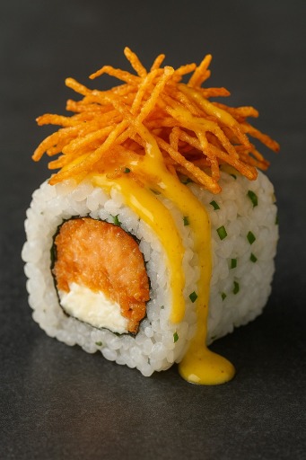 Salmon tempura, ciboulette, cubierto con batata frita y salsa pisco