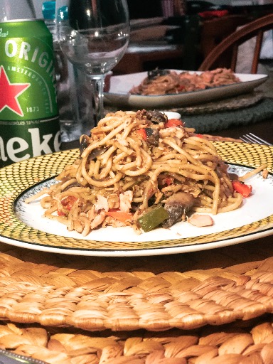 Pollo en cubos, arroz, cebolla morada, jengibre y mani en reduccion de soja, vino y azucar.